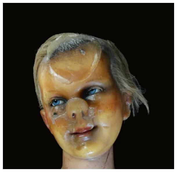 德国19世纪的一个儿童蜡像,由于在发现的时候,它的脸朝下受挤压,所以变成了这幅诡异的样子……