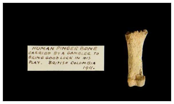 英国斯卡伯勒收藏的一节人类指骨,这本来属于一个赌徒,据说是用来增添好运的“幸运人手指骨头”……