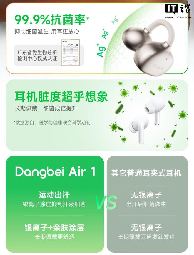 Dangbei Air 1 耳机配备 12mm 动圈双单元,通过 LDHC 5.0 和 Hi-Res 金标认证,支持 QQ 音乐臻品音质;行业首创透感晶钻银护技术,拥有 99.9% 抗菌率,宣称拯救油耳、敏感耳。