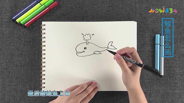 先用弧线画出喷出的水柱,并用小弧线装饰水柱,再在水柱旁边添加两滴水珠,再一条弧线画出鲸鱼的头;用流畅自然的弧线画出鲸鱼的鱼背、鱼腹,用曲线画出鱼尾和胸鳍;用圆形画出鱼眼,再完善一下鱼嘴的细节,画完之后给大鲸鱼涂上好看的颜色就可以了。