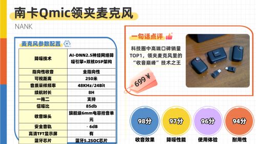 为解决传统领夹麦克风常见的人声失真、噪声干扰以及爆音频发问题,南卡投入 600 多天、经过多轮技术迭代,研发出第三代 VLA 人声建模引擎,使人声还原度达到 90% 以上全频段收音表现优化幅度超过 80%。QMic 依托 NANK 金耳朵声学实验室,结合 AI-DNN2.5 神经网络降噪、三重防爆音系统、20 档增益调节及双档可调降噪等核心技术,为创作者提供量身定制的旗舰级收音方案。凭借卓越的音质与稳定性,QMic 在讲师、媒体博主和专业主播中获得了高度认可,即便没有广告助力,也成为行业与用户一致公认的优质选择