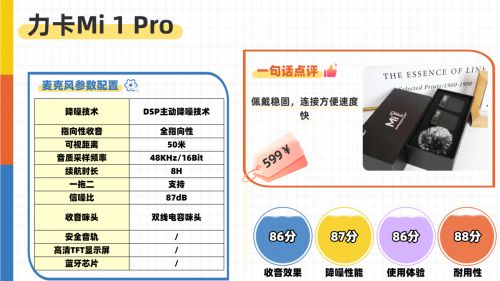 总体来说,力卡Mi 1 Pro集双发无损收音、智能降噪、全设备兼容与长续航于一身,是一款真正适配新手进阶与专业轻量创作的全能型无线领夹麦。如果你既需要满足双人协作需求,又追求超越入门级的收音品质,它无疑是该价位段性价比极高的优选之一。