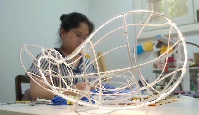 为更好还原游戏角色,张菁毅反复调整设计稿,用铅丝精准弯出骨架,再用棉花纸包裹骨架防锈定型,随后以纸钉仔细固定,最关键的是面料,最终选用轻透的雪纺与涤纶替代传统绸缎,让光线温柔渗透,仿佛鲸鱼自然发光,与游戏中的视觉效果高度契合,最后再细心剪出眼部纹样,一点点粘贴到位。一盏仿佛会呼吸的鲸鱼灯,就这样在指尖诞生。