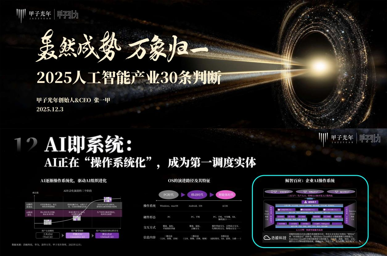 此次盛典以“轰然成势,万象归一”为主题在北京举办,浩鲸科技旗下企业AI操作系统“鲸智百应”同步入选甲子光年《2025年人工智能产业30条判断》推荐案例,其精准的产业定位与扎实的实践价值获得行业高度认可。