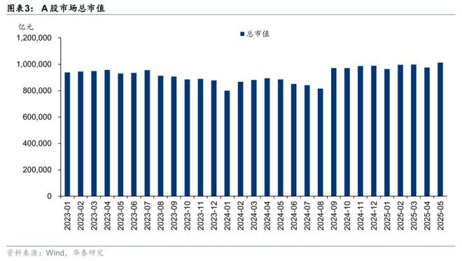 资本市场在改革推进中不断扩容。近年来,资本市场底层逻辑已发生深刻变化,顶层设计绘制改革新蓝图,从上市入口、公司质量、退市管理等全方位构建生态;引入中长期资金、完善公募基金改革,均更侧重投资功能建设、保护投资者利益。在利率中枢逐步走低的环境下,存款搬家效应或将显现,权益市场有望迎来较为优质的发展周期。在改革政策的持续呵护下,权益市场不断扩容,截至2025年5月,A股总市值已突破百万亿元大关,保持稳步增长态势。