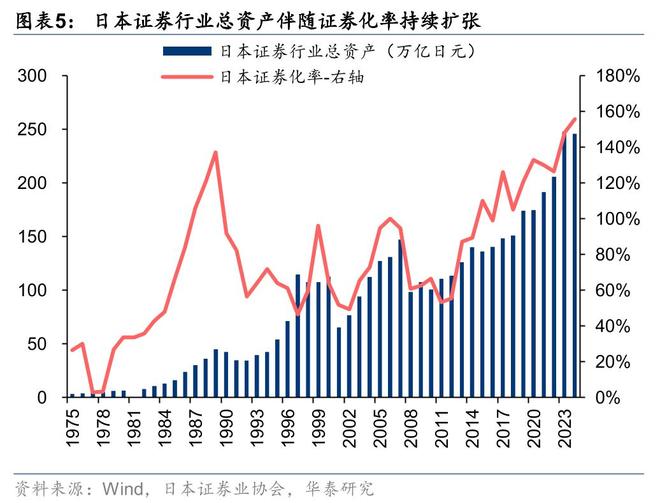 券商展业受益于蓬勃发展的资本市场。证券行业为资本市场的重要参与者,起到资本市场“看门人”的作用,行业的各项业务均与资本市场发展息息相关。如经纪、两融及股票质押,与权益市场景气度高度同步;投行、资管、投资则与权益、固收市场都有较强的关联度。从海外发展经验看,如日本证券行业从上世纪80年代开始,伴随证券化率的快速扩张、行业资产负债表迅速扩容,1989年末证券化率从1980年末的34%提升至137%,同时期行业总资产从6.6万亿日元提升至45.1万亿日元,扩张接近6倍。1990年代之后市场调整、证券化率波动;2010年代之后恢复上行趋势,行业总资产基本伴随证券化率趋势变动。对比而言,目前我国证券化率相较日本、美国长期稳定于100%以上的水平,仍有较强的拓展空间。在监管持续呵护资本市场健康运行的基调下,我们认为未来证券化率有望稳步上行、证券行业展业仍有拓展空间。