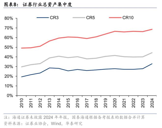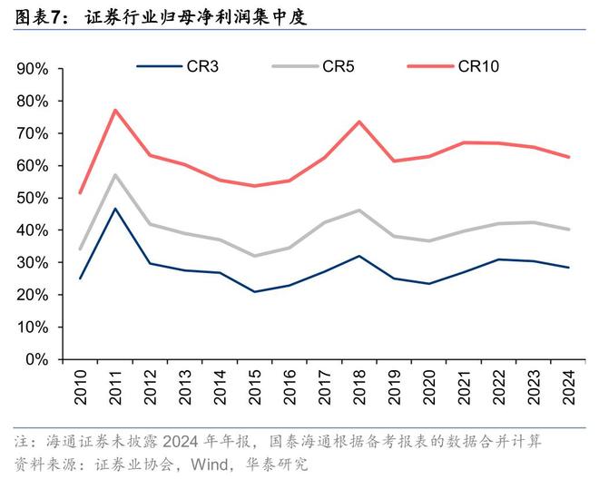 行业并购重组潮起,头部效应持续强化。2023年来证券行业迎来新一轮并购重组热潮,国泰君安吸收合并海通证券打响头部上市券商吸收合并“第一枪”。尤其是对于A、H同时上市的公司,本次合并是历史性的创新,且推动行业进一步向头部集中,强化马太效应。当前国泰海通、国联民生等并购重组事项均已进入交易后的整合阶段,行业收入、净利润集中度进一步提升。2024年行业营业收入CR3、CR5、CR10已达到36%、50%、74%(其中国泰海通根据备考报表的合并数据计算),较2010年大幅提升11、16、22个百分点;归母净利润CR3、CR5、CR10为28%、40%、63%,较2010年提升3、6、11个百分点,头部券商的盈利韧性在波动的市场中更为凸显。