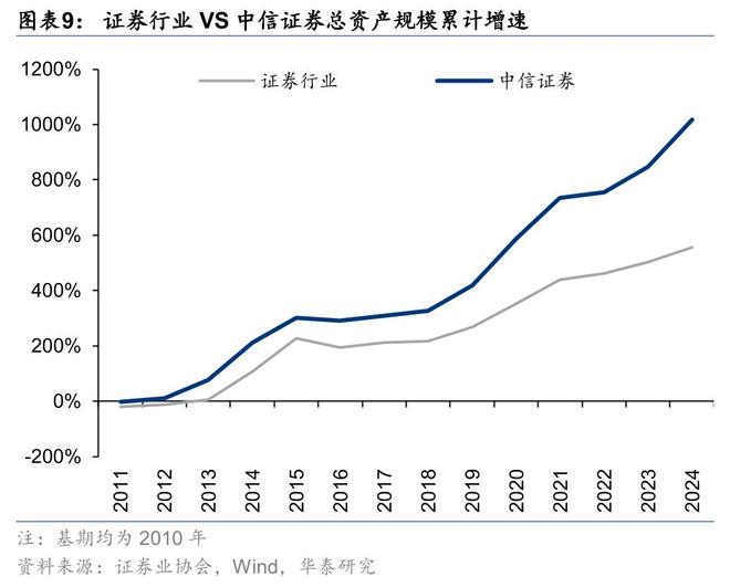 行业资产规模集中度持续提升,头部券商在扩表周期中扩张更快。近年来行业整体资产负债表持续扩张,过去5年行业总资产规模增长78%,其中头部券商凭借更合理的资产结构、更高的资金运用效率及更完善的风险管控机制等优势,规模提升更快,推动行业资产集中度持续提升。2024年末证券公司总资产CR3、CR5、CR10分别为33%、44%、69%,较2010年提升13、15、19个百分点。
