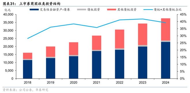 不同的是,2023年以来的扩表由债牛行情+轻资本业务承压共同驱动,或带来更强持续性。分阶段看,2018-2019年是由债市行情驱动的阶段性调仓(2020年上市券商自营固定收益类证券及证券衍生品/净资本指标增长明显放缓),2021-2022年主要系行业迎来再融资潮,资本金扩张驱动固收投资扩表,2023-2024年则是债牛行情+轻资本业务承压共同驱动的主动增润行为,经营战略和结构有所调整,或将带来更强的扩表持续性。且从固收投资的内部结构看,交易性资产和配置性资产的比例趋于平衡,2024年上市券商债权投资+其他债权投资占固收类投资的比例为39%。