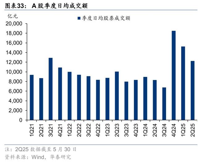 2024年以来行业经营整体呈现边际回暖态势,市场景气度回升驱动券商业绩修复。2024和1Q25上市券商扣非后归母净利润分别同比+14%、+55%,其中投资、经纪业务是增长的核心驱动力。一方面,2024年债市表现强劲,1Q25虽有波动,但季末长债利率小幅回落,同时权益市场在1Q25走出结构性行情,投资类收入2024年和1Q25分别同比+30%、+51%。另一方面,市场交易持续活跃,2024年和1Q25全市场日均股票、基金成交额同比分别+22%和+71%,驱动经纪净收入触底回升,同比分别+10%、+49%。