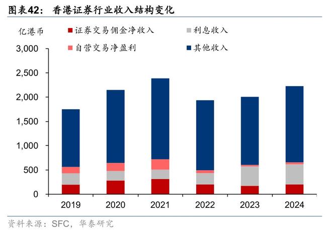 国际业务收入多元化、探索空间广。香港证券行业收入结构与内地有较大的区别。根据SFC统计数据,2019-2024年自营交易净盈利占整体营收比例始终低于10%。从2024年的收入占比细分结构看,向集团公司收取的管理费用26%、利息收入总额19%(未扣除利息支出,毛收入口径)、资产管理收入17%、经纪类合计11%(来自证券交易的净佣金收入9%、来自期货及期权交易/杠杆式外汇交易和虚拟资产交易的净佣金收入2%);投行类合计6%(包销及配售证券收入5%、就机构融资提供意见的收入1%)、自营交易净盈利仅占比2%。由此可见,香港证券行业收入呈现多元化特征、但自营交易收入的占比较低。展望未来,国际业务是券商拓宽收入来源、推动收入多元化的利器;也是通过满足客户境外和跨境业务需求、服务实体经济发展的重要路径,尤其是与金融投资相关的综合业务(如方向性投资、做市、跨境衍生品等),有望带来新的扩表空间与业务增量。
