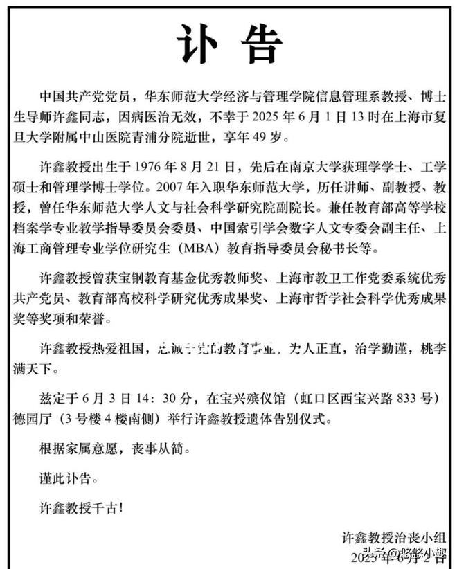 根据澎湃新闻最新报道:华东师范大学经济与管理学院信息管理系教授、博士生导师许鑫去世,年仅49岁!