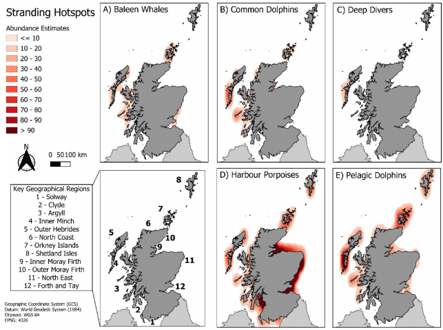 地理分析揭示类群特异性分布:港湾鼠海豚52%搁浅集中于东海岸的莫瑞湾特别保护区(SAC),而其他类群90%聚集于西海岸。区域季节性分析显示,短吻真海豚冬季在克莱德湾的搁浅率是其他区域的3倍,而须鲸在明奇海峡夏季出现显著聚集(p0.05)。