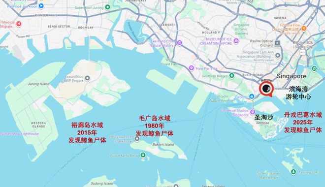 十年前,2015年,同样在南部海域,裕廊岛附近发现一具长达10.6米的雌性抹香鲸尸体。在它的胃部发现大量深海生物猎物,说明很可能生存于印度洋深海。它脊椎断裂,有严重外伤,相信是被商船撞击而死。