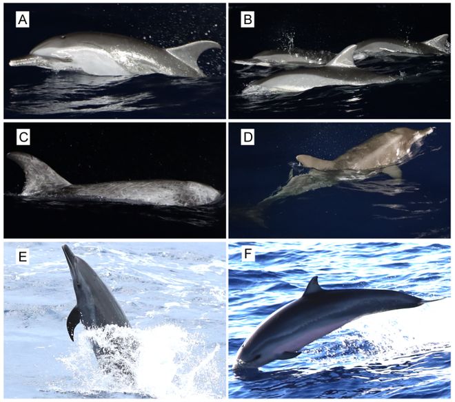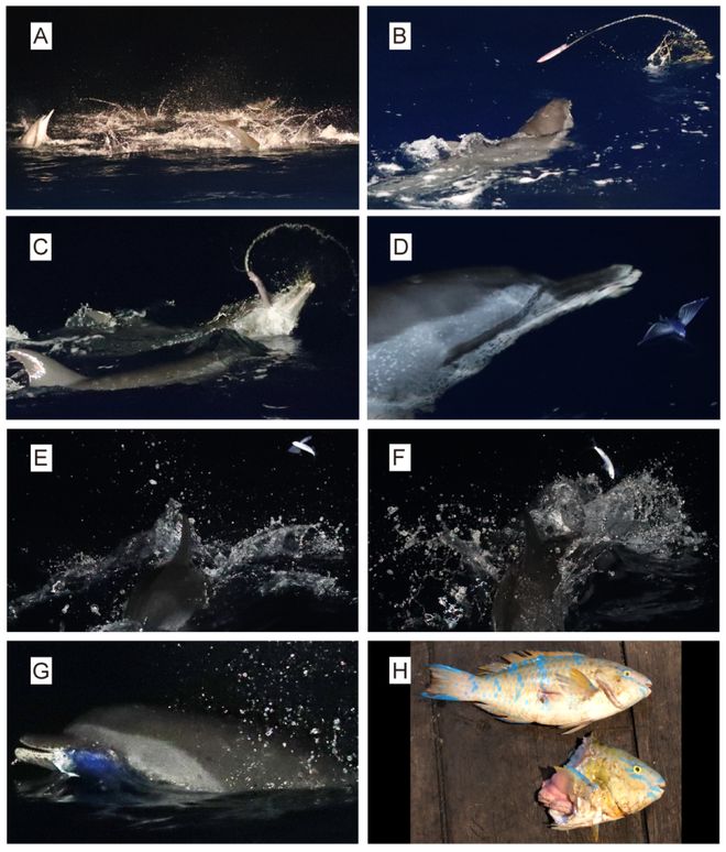 研究结果显示,在灯光罩网作业时互作的鲸类种类主要有4种,包括热带点斑原海豚、飞旋原海豚、里氏海豚和糙齿海豚,其中热带点斑原海豚为优势种(图3)。在灯光罩网作业时,热带点斑原海豚和弗氏海豚有频繁的跟船行为,而里氏海豚通常会与渔船保持一定距离。同时,团队还发现了海豚一些有趣的行为,如合作捕食和追逐鸢乌贼、飞鱼以及礁栖鱼类(如青点鹦嘴鱼)等(图4)。另外,作业区域还出现过玳瑁和太平洋丽龟。
