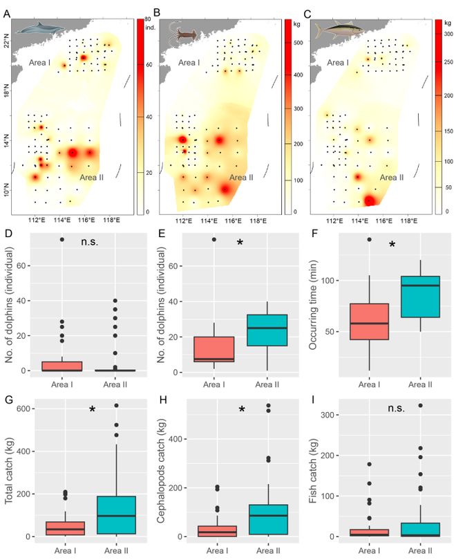 在一百多次的灯光罩网作业观察中,研究团队发现南海北部的鲸类出现概率要低于南部海域,但出现在作业区域的时间较早,暗示北部海域的海豚可能对渔业资源具有更强的依赖性。空间分布分析表明,南部海域的海豚群体数量及渔获量均高于北部,这反映出该区域丰富的渔业资源支撑了更大规模的海豚种群。此外,相对于科研目的的捕捞,商业化捕捞模式下鲸类的出现概率明显上升。基于这些发现,研究人员建议采取有效措施缓解鲸类在渔业活动中面临的误捕风险,并将鲸类的食物需求纳入渔业资源管理措施中,以此推动南海外海鲸类保护和渔业可持续发展。